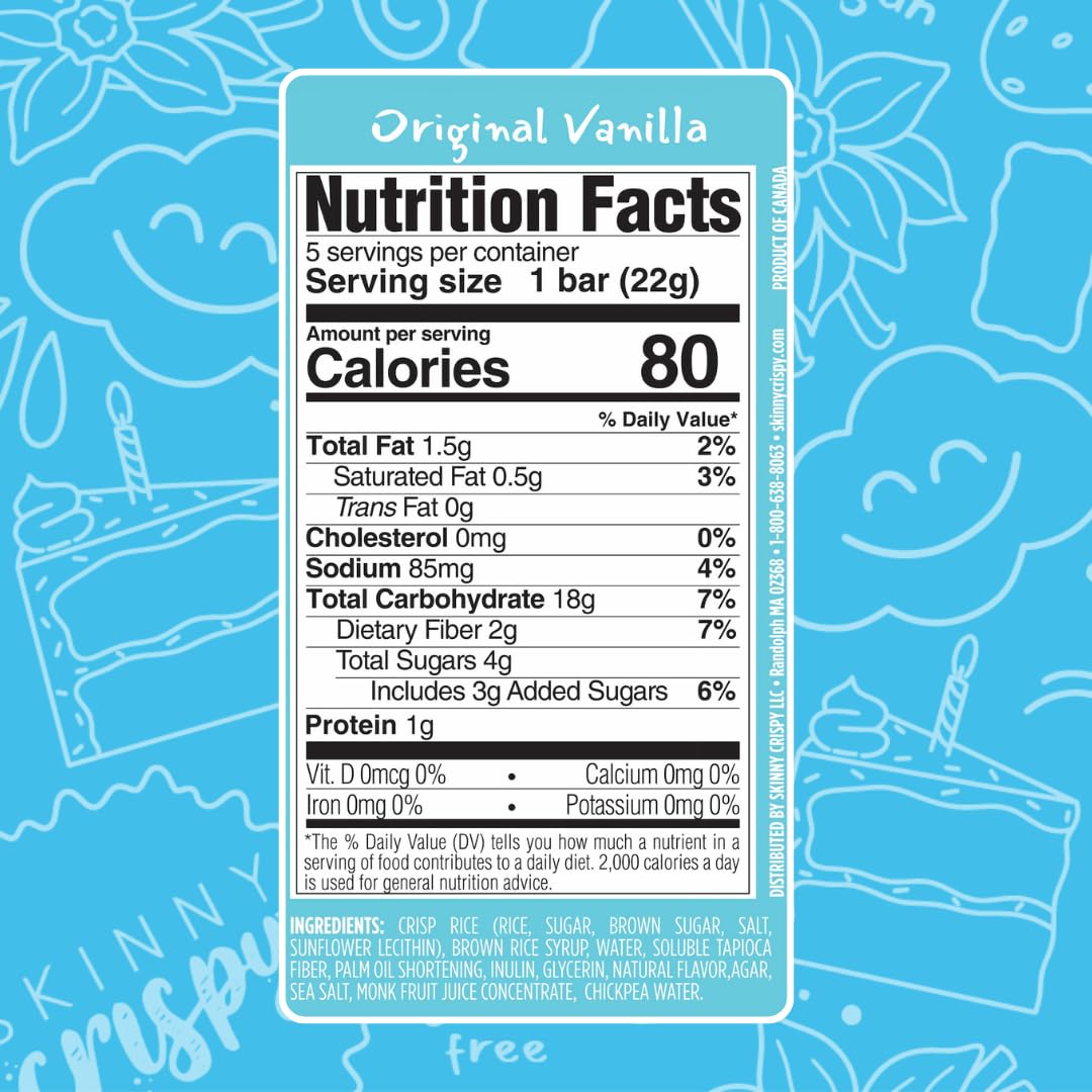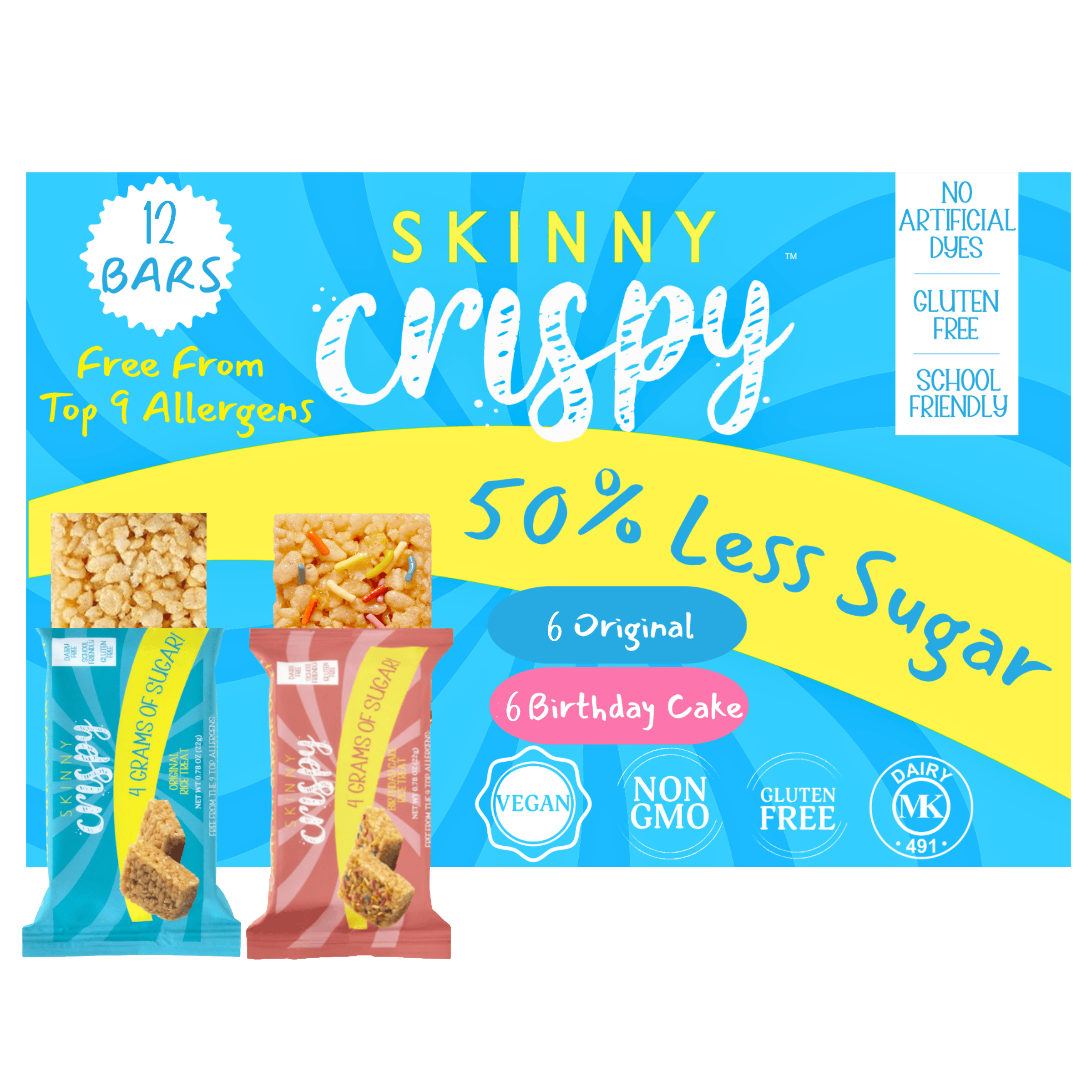 Your new favorite snack just got even better. This variety pack is a mix of light, crispy rice treats that are as delicious as they are better for you. With just 4g of sugar, lower calories, and free from the top 9 allergens, these treats are perfect for any time you need a crispy, gooey pick-me-up. Each box includes 6 Birthday Cake bars and 6 Vanilla bars—so you can enjoy a little of both.